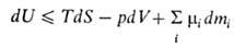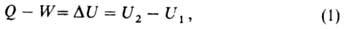 где U1 и U2 - внутренняя энергия системы в начальном и конечном состояниях соответственно. Уравнение (1) выражает закон сохранения энергии в применении к термодинамическим процессам, т.е. процессам, в которых происходит передача теплоты. Для циклического процесса, возвращающего систему в начальное состояние, ΔU=0. В изохорных процессах, т.е. процессах при постоянном объеме, система не совершает работы за счет расширения, W=0 и теплота, переданная системе, равна приращению внутренней энергии: Qv=ΔU. Для адиабатических процессов, когда Q=0, ΔU=-W. Внутренняя энергия системы как функция ее энтропии S, объема V и числа молей mi i-того компонента представляет собой термодинамический потенциал. Это является следствием первого и второго начал термодинамики и выражается соотношением: