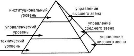 Наряду с горизонтальным разделением труда может иметь место и вертикальное разделение труда. Основное назначение этого вида разделения труда — координирование действий людей, объединенных общей структурой данной организации для выполнения общих целей. Для более наглядного усвоения основных уровней управления представим их в виде пирамиды (см. рис 2, [15]).