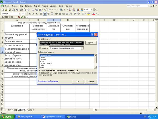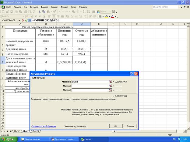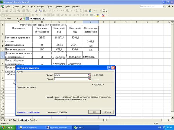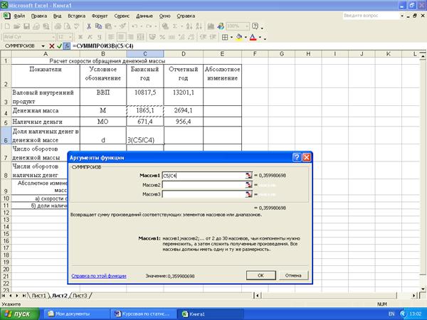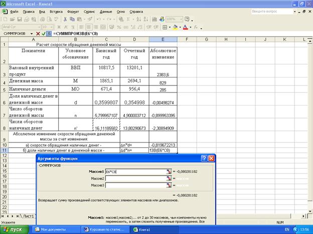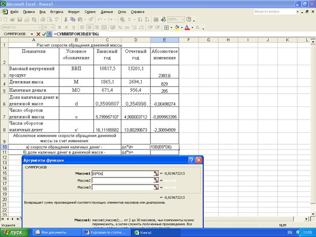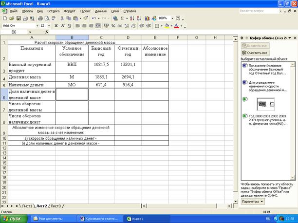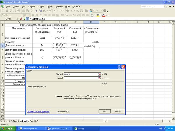 Статистические расчеты скорости обращения денежной массы и ее изменения за счет отдельных факторов выполнены с применением пакета прикладных программ обработки электронных таблиц MS Excel в среде Windows.