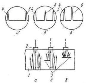 Зондирующий импульс УЗК, пройдя через металл, отражается от противоположной поверхности изделия и. возвращаясь, частично попадает на преобразователь (Рис. 9.1 , а). На экране ЭЛТ возникает донный (концевой) сигнал 5. При наличии дефекта 3 импульс УЗК отразится от него раньше, чем от противоположной поверхности детали (Рис.9.1 ,6). Между начальным 4 и донным (концевым) 5 сигналами возникает промежуточный сигнал 6. Если дефект полностью перекрывает путь ультразвуковому пучку, то на экране ЭЛТ наблюдается только начальный сигнал и сигнал от дефекта (рис. 9.1 ,в).