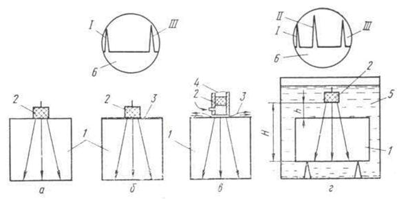 При иммерсионном способе (Рис. 9.2, г) акустическая связь между преобразователем и изделием создается через значительный слой жидкости. Для этого преобразователь и изделие