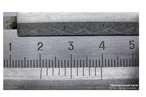 Далее смотрим, какая насечка нониуса совпадает со шкалой штанги.
