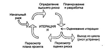 Видно, что критерием управления этим жизненным циклом является уменьшение риска. Работа начинается с оценки начального риска. В ходе выполнения каждой итерации риск пересматривается. Риск связывается с каждой итерацией так, что ее успешное завершение уменьшает риск. План последовательности реализаций гарантирует, что наибольший риск устраняется в первую очередь.