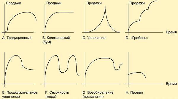 Не все товары имеют кривую ЖЦТ, аналогичную той, которая изображена на рис. 7.5. Форма кривой определяется многими факторами: потребительными свойствами товара, отношением к нему потребителей и т. п. Наиболее часто встречающиеся формы ЖЦТ приведены на рис. 7.61.