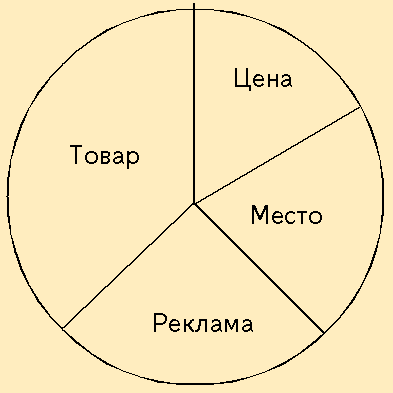 Выше уже указывалось, что внутренние факторы маркетинга, маркетинговую смесь называют еще «комплексом маркетинга», «четырьмя пи» («4р») ¾ по начальным буквам слов, обозначающих эти факторы в английском языке. Но если осуществлен более или менее точный расчет «рецепта», то его иногда называют маркетинговой формулой1. В данной книге активно будет использоваться это название, поскольку оно четко указывает на то, что могут и должны быть (!) установлены точные пропорции внимания фирмы, а точнее ее затрат, по каждой составляющей комплекса. В обобщенном виде внутренние факторы маркетинга можно представить в форме следующего «пирога» (рис. 7.8).