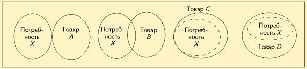 Как следует из рис. 7.1, любая потребность может быть либо совершенно не удовлетворена, либо удовлетворена частично, либо удовлетворена полностью. Ясно, что чем полнее товар соответствует (отвечает) нуждам и потребностям покупателей, тем большего успеха на рынке добьется производитель. Таким образом, производители должны выяснять (посредством исследования рынка) нужды и потребности их потенциальных потребителей, а затем создавать товар, как можно в большей степени удовлетворяющий эти нужды и потребности. Идеальной будет ситуация в случае с товаром С. Достичь такого идеала трудно, но каждый производитель (товара или услуги) должен стремиться к этому. На рисунке 7.1 товар С полностью и с некоторым небольшим «запасом» перекрывает потребность Х. Что касается товара D, то он с гораздо большим «запасом» перекрывает потребность Х. Это говорит об избыточности функций этого товара в решении проблем потребителя. Если «запас» велик, то товар также может оказаться невостребованным (или востребованным в незначительной степени), и не только по причине более высокой цены, но и по причинам нежелания применять эти функции, ощущения ненужности их.