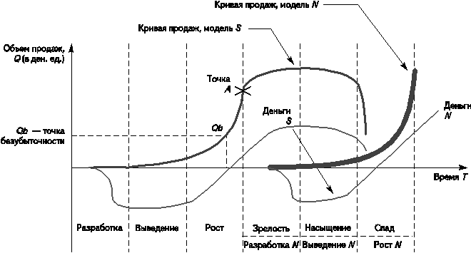 Поскольку спрос представляет собой довольно динамичную рыночную категорию, постольку, в зависимости от его колебаний, в структуре ЖЦТ можно выделить несколько стадий. В учебной литературе упоминается разное количество стадий ЖЦТ. Наиболее полным является набор из шести. Они представлены на рис. 7.5 при рассмотрении двух моделей товара S и N: