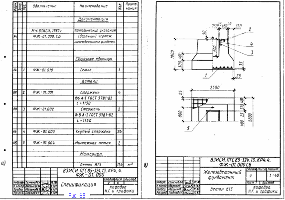 Выполняется комплексная работа: конструирование железобетонного изделия и составление спецификации, сборочного чертежа, чертежа сборочной единицы и детали железобетонного изделия. Варианты задания приведены в табл. 30 и на рис. 67. По своему варианту студент подсчитывает количество стержней и их длину, учитывая габариты конструкции. Арматурную сварную сетку и арматуру размещают так, чтобы они имели защитные слои из бетона в 25...30 мм это предохраняет их от коррозии под воздействием внешней среды. Глубину гнезда под колонну принять h/2.