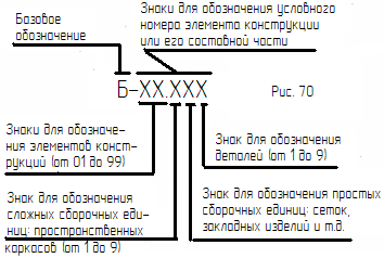 г) в графе «Обозначение» указывают: в разделе «Документация» - обозначение настоящих методических указаний (МУ ВЗИСИ, 1987) и обозначение сборочного чертежа изделия, в разделах «Сборочные единицы», «Детали» - обозначение соответственно чертежей арматурной сетки и чертежей стержней и монтажной петли. Обозначение составной части изделия в спецификации является одновременно и обозначением конструкторского документа (чертежа), на котором изображена эта составная часть. Обозначение документов, входящих в состав железобетонных изделий, целесообразно принимать по предметной системе построении обозначения, где различаются следующие взаимосвязанные виды документов и их обозначение (рис. 70). Буквенно-цифровое обозначение сборочных чертежей сопровождается индексом СБ;