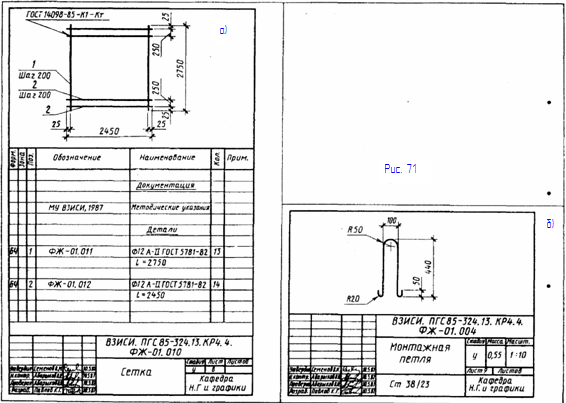В нашем примере разделы спецификации железобетонного изделия (см. рис. 68,а содержат: раздел «Документация» - настоящие методические указания и сборочный чертеж железобетонного изделия; раздел «Сборочные единицы» - сборочные чертежи составных частей изделий (арматурная сетка); раздел «Детали» - отдельные стержни, не входящие в арматурную сетку, а также монтажные петли; раздел «Материал» - бетон, используемый в изделии.