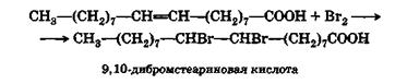 В молекуле линолевой кислоты две двойные связи. Она может присоединять четыре атома водорода или галогена. В молекуле линолевой кислоты три двойные связи, поэтому она присоединяет шесть атомов водорода или галогена. Обе кислоты, присоединяя водород, переходят в стеариновую кислоту.