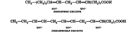 Линолевая С17Н31СООН и линоленовая С17Н29СООН кислоты еще более ненасыщены, чем олеиновая кислота. В виде сложных эфиров с глицерином — глицеридов — они являются главной составной частью льняного и конопляного масел: