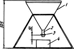 Стандартная воронка состоит из корпуса 1, который представляет собой усеченный конус, заканчивающийся трубкой 2 с задвижкой 3. Под трубку устанавливают заранее взвешенный мерный сосуд. Расстояние между верхним обрезом сосуда и задвижкой воронки 50 мм. Мерный сосуд заполняют с избытком, а излишек материала срезают линейкой вровень с краями сосуда. После удаления излишка материала сосуд с материалом взвешивают.