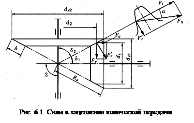 Зацепление конических колес можно рассматривать как качение делительных круговых конусов шестерни и колеса. Диаметры основания делительных конусов шестерни и колеса и их числа зубьев связаны соотношением и= z1/z2 = sinδ2/sinδ1 (рис. 6.1). При угле Σ = 90° tgδ1 = z1/z2, tgδ2 = u.