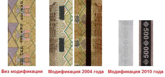 Скрытые радужные полосы. Это новый признак подлинности банкнот, присутствующий на всех номиналах (10, 50, 100, 500, 1000 и 5000 рублей) модификации 2004 года и выше. На лицевой стороне банкнот расположено поле, заполненное тонкими параллельными линиями. При рассматривании банкноты на расстоянии 30-50 см. перпендикулярно направлению взгляда поле выглядит однотонным, При рассмотрении банкнот под острым углом, на поле возникают многоцветные (радужные) полосы.