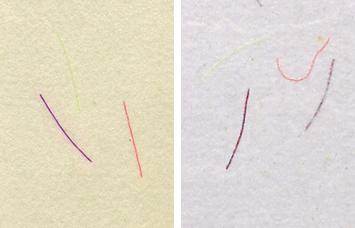 5. Защитные волокна. В бумаге банкнот хаотично расположены цветные защитные волокна (с 2001 года используются двухцветные волокна). Это ранее существовавший признак подлинности купюр. Если купюру рассматривать под увеличительным стеклом, то создаётся впечатление, будто видишь кусочки тонких и коротких ниточек разного цвета, втесненных в бумагу. Опытные кассиры банков поддельную купюру определяют даже на ощупь, говоря, что структура бумаги с защитными волокнами необычна.