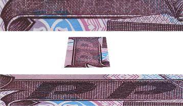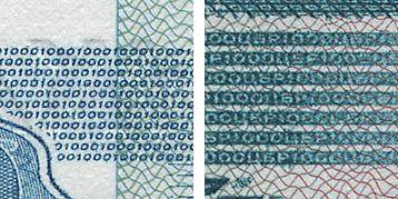 2. Микротекст. На верхней и нижней границе изображения декоративной ленты имеется микротекст в виде повторяющихся чисел (500, 1000 или 5000, в зависимости от номинала купюры). В верхней и нижней частях лицевой стороны банкноты имеются фрагменты, заполненные наклонными полосами из многократно повторяющегося числа (500, 1000 или 5000, в зависимости от номинала купюры).