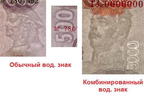 На купюрах номиналом 5000 рублей модификации 2010 года появляется новый вид водяного знака - «Комбинированный водяной знак», он расположен на правом купонном поле и включает в себя полутоновый водяной знак (портрет Н.Н. Муравьёва-Амурского) и примыкающий к нему филигранный водяной знак - цифровое обозначение номинала (число 5000). Филигранный водяной знак имеет участки более светлые, чем бумага и полутоновый водяной знак. Его отличает наличие темных штрихов, оттеняющих цифры и создающих эффект их объемности.