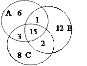 В пересечении множеств А, В и С запишем число 15, так как по условию n(AÇBÇC)=15. В множестве AÇB\С запишем число 16—15=1, в множестве BÇC\А - число 18-15=3, в множестве BÇC\А—число 17-15=2, в множестве A\(BÈC)— число 25-(1+15+3)=6, в множестве В\(А ÈC) — число 30-(1 + 15+2)= 12, в множестве С\(АÈВ)— число 28-(3+15+2)=8. Чтобы найти n(АÈВÈС), достаточно сложить записанные числа, поскольку они соответствуют множествам, не пересекающимся между собой. Получим число 47 > 45, что невозможно по условию задачи.