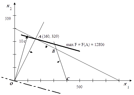 Решая совместно уравнения граничных прямых АВ и ОА, находим координаты точки А: х1=160, х2=320. При этом F*=12800.