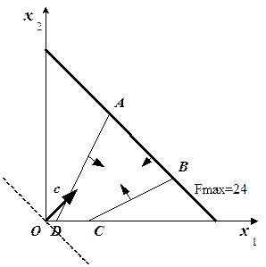 , областью допустимых решений является четырехугольник ОАВС. Далее надо построить вектор с = (