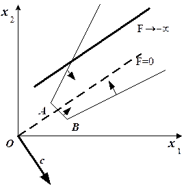 ). Так как он необходим лишь для выяснения направления возрастания целевой функции, иногда для большей наглядности удобно строить вектор lс (l>0). В нашем примере взято l=10 и построен вектор lс=(100; 350). Перпендикулярно к этому вектору проводим линию уровня F=0. Параллельным перемещением прямой F=0 находим точку А, в которой целевая функция достигает максимума.