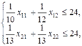 Пример 1.3. Двум погрузчикам разной мощности за 24 часа нужно погрузить на первой площадке 230 т, на второй – 168 т. Первый погрузчик на первой площадке может погрузить 10 т в час, на второй – 12 т. Второй погрузчик на каждой площадке может погрузить по 13 т в час. Стоимость работ, связанных с погрузкой 1 т, первым погрузчиком на первой площадке 8 р., на второй – 7 р., вторым погрузчиком на первой площадке 12 р., на второй – 13 р. Нужно составить план работы, т. е. найти, какой объем работ должен выполнить каждый погрузчик на каждой площадке, чтобы стоимость всех работ по погрузке была минимальной. Причем по техническим причинам первый погрузчик на второй площадке должен работать не более 16 часов.