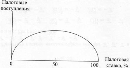 Кривая хорошо показывает, что ставка налога не должна превышать 50%, так как дальнейшее ее повышение влечет снижение налоговых поступлений. Последние могут опуститься до нуля, если установить 100%-ю ставку. Эта тенденция обусловлена тем, что у плательщиков исчезает стимул иметь высокие доходы, так как все равно большую часть их придется отдать. Кроме того, получаемые доходы плательщики начинают скрывать. Наиболее выгодная величина налоговой ставки зависит от конкретных условий в той или иной стране. Она может быть довольно высокой в военное время. Если в стране процветает казнокрадство, налоги идут на строительство роскошных дач государственных чиновников,то даже не очень высокая ставка вызывает возмущение плательщиков.