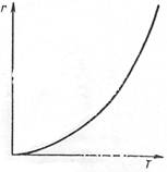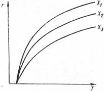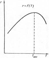 Рис. 5. Зависимость скорости реакции r от температуры T для простой необратимой реакции (A→R ± Q).
