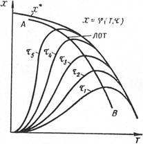 Рис. 9. Зависимость степени превращения α от температуры Т для простой обратимой экзотермической реакцииA↔R+Q (τ1<τ2<τ3<τ4<τ5)