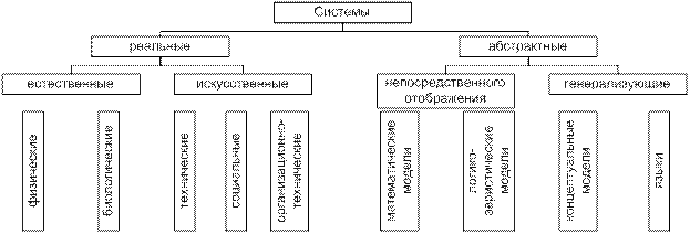 Абстрактные системы разделяют на системы непосредственного отображения (отражающие определённые аспекты реальных систем) и системы генерализирующего (обобщающего) отображения. К первым относятся математические и эвристические модели, а ко вторым – концептуальные системы (теории методологического построения) и языки.