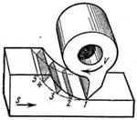 При цилиндрическом фрезеровании резание осуществляется зубьями, расположенными на периферии фрезы, и обработанная поверхность 1 является плоскостью, параллельной оси вращения фрезы 2.