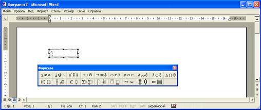 Для вставки новой формулы в текст, начиная с позиции курсора, нужно воспользоваться командой Вставка - Объект. В появившееся на экране диалоговом окне Вставка объекта выбирается параметр - MicrosoftEquation 3.0. При этом окно MicrosoftWordбудет содержать видоизмененное меню, новую панель инструментов Формулас кнопками-шаблонами разных символов, а также поле для введения формулы (Рис.5).