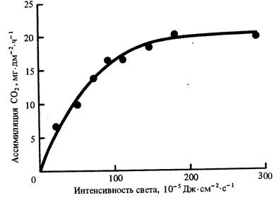 Для большинства растений прямая зависимость интенсивности фотосинтеза от интенсивности светапроявляется лишь при сравнительно небольшой величине последнего. В дальнейшем при повышении освещенности прирост фотосинтеза становится все меньше и меньше, и, наконец, кривая фотосинтеза переходит на плато. Это состояние, называемое световым насыщением (СН), свидетельствует о том, что интенсивность фотосинтеза в данный момент больше всего зависит от других, нежели освещенность факторов.
