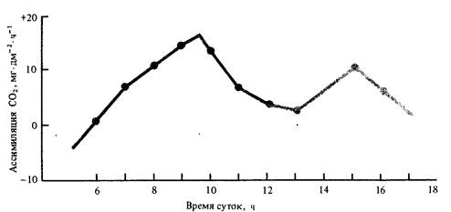 В большинстве же случаев по мере повышения освещенности и температуры интенсивность фотосинтеза достигает максимальных значений перед полуднем, затем наблюдается ее спад с последующим вторым максимумом, образуя двухвершинную кривую. При очень жаркой и сухой погоде кривая становится одновершинной с максимумом в ранние утренние часы. Наблюдающийся спад фотосинтеза получил название полуденной депрессии.. Среди условий, вызывающих эту депрессию, следует назвать водный дефицит листьев, закрывание устьиц, перегрев листьев, слабый отток ассимилятов из хлоропластов, фотоокисление хлорофилла и инактивацию ферментов, в том числе карбоксилаз, на сильном свету, резкое повышение дыхания, понижение содержания СО2 около листьев в связи с ее усиленным потреблением зелеными листьями.