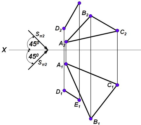 Строим действительные тени точек А1 В1С1 Е1. Соединяем тени точек треугольника Ап1 Вп1 Сп1 между собой и тень от прямой Dп1 Еп1 пересекает тень от треугольника в точках 1п1 и 2п1. Это значит, что прямая DЕ будет отбрасывать тень на проекции треугольника.