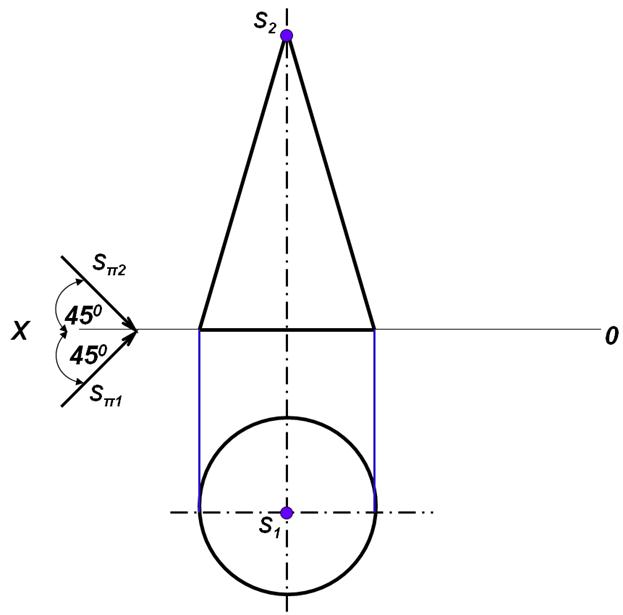 Переносим точки 3 и 4 на фронтальную проекцию и соединяем с вершиной S2. Образующая 42 S2 является видимой границей света и тенью на фронтальной плоскости проекций, а образующая 32 S2 является невидимой границей, поэтому проводится штриховой линией.