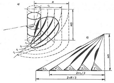 Рис. 6. Винтовая поверхность лопасти (а) и шаговые угольники (б)