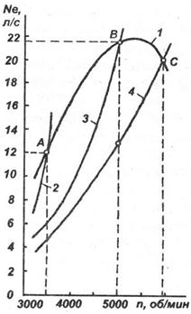 Для каждого конкретного сочетания судна и двигателя существует оптимальный гребной винт. Для рассматриваемого примера такой оптимальный винт имеет характеристику 3, которая пересекается с внешней характеристикой двигателя в точке Д, соответствующей его максимальной мощности.