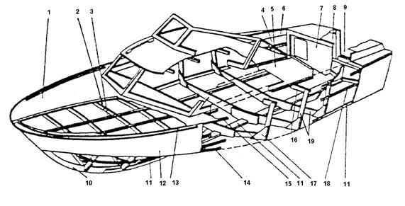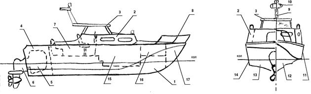 1-корпус судна; 2-надстройка; 3-рубка; 4-моторная ниша; 5-главный двигатель; 6-реверс-редукторное устройство с гребным винтом; 7-кокпит; 8-леер; 9-мачта; 10-ходовые огни; 11-надводный борт; 12-редан; 13-днище; 14-подводный борт; 15-каюта; 16-кубрик; 17-форпик.