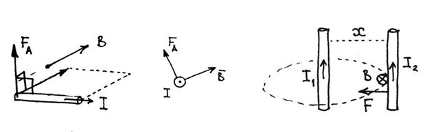 Начнем с того, что сила, действующая со стороны магнитного поля на ток, зависит от взаимной ориентации тока и вектора B. Если ток и вектор B параллельны, то сила равна нулю. Сила максимальна, если ток перпендикулярен полю B (рис), в этом случае сила Ампера будет вычисляться по формуле
