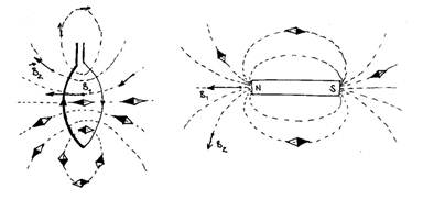 Магнитные явления, как и электрические, известны с древних времен. Известно свойство магнитного железняка притягивать железные предметы, в древнем Китае было известно свойство магнитной стрелки устанавливаться вдоль меридиана. Конец магнитной стрелки, указывающий на север, назовем северным, противоположный конец – южным. Стрелка должна вращаться без трения (свободно), поскольку магнитное поле земли весьма слабое. Вырезанный из магнитного материала стержень приобретает аналогичные свойства. Как бы его ни вырезали, один конец его становится северным полюсом, другой – южным. Два таких стержня будут взаимодействовать. Одноименные полюса отталкиваются друг от друга, разноименные – притягиваются. Причем сила их взаимодействия уменьшается при увеличении расстояния между ними.Это общее свойство сил в физике.
