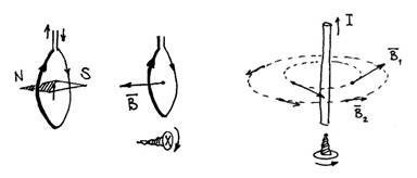 Чтобы связать направление вектора индукции магнитного поля в центре витка с направлением тока в витке, используют правило буравчика (с правой нарезкой). Вращая его в направлении тока в витке, мы будем вкручивать его в направлении вектора индукции B. В этом направлении установится северный конец стрелочки. Для определения направления B прямого тока нужно использовать буравчик несколько иначе.