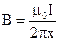Прямой ток создает поле, убывающее по мере удаления от него. Если точка находится на расстоянии x от очень длинного прямого провода, то индукция вычисляется по формуле