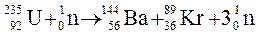 В силу закона сохранения массы,суммы массовых чисел слева и справа должны быть одинаковыми. 235+1=144+89+3. В силу закона сохранения заряда, суммы зарядовых чисел слева и справа должны быть одинаковыми. 92+0=56+36+0. Реакция начинается с взаимодействия нейтрона, имеющего достаточную кинетическую энергию, с ядром урана. Ядро становится неустойчивым, и распадается на два осколка с вылетом трех нейтронов.