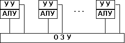 · Архитектура с параллельными процессорами. Здесь несколько АЛУ работают под управлением одного УУ. Это означает, что множество данных может обрабатываться по одной программе — то есть по одному потоку команд. Высокое быстродействие такой архитектуры можно получить только на задачах, в которых одинаковые вычислительные операции выполняются одновременно на различных однотипных наборах данных. Структура таких компьютеров представлена на рис.