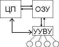 - процессор (ЦП), т.е. устройство, которое перерабатывает информацию, оперативная память (Оперативное Запоминающее Устройство, ОЗУ), и устройства управления внешними устройствами (УУВУ), соединенные линиями передачи данных в единое целое. Если добавить к такому комплексу аппаратуры устройства связи с внешним миром, т.е. устройства ввода исходных данных и программы и вывода результата, то придем к классической пятиблочной структуре Неймана, несколько модифицированный вид, которой показан на рисунке 2 (первоначально устройство ввода и вывода изображалось одним блоком, а память не разделялась на основную и внешнюю).