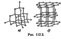 Типичными примерами атомных кристаллов могут служить алмаз и графит. Оба эти вещества тождественны по химической природе (они построены из атомов углерода), но отличаются кристаллическим строением. На рис. 112.2, а показана решетка алмаза, на рис. 112.2, б — решетка графита. На этом примере отчетливо видно влияние кристаллической структуры на свойства вещества.