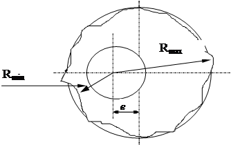 Радиальное биение поверхности вращения является результатом совместного проявления отклонения от круглости профиля рассматриваемого сечения и отклонения его центра относительно базовой оси (рис.77). Определяется как разность наибольшего и наименьшего расстояний точек реальной поверхности до базовой оси в сечении перпендикулярном этой оси.
