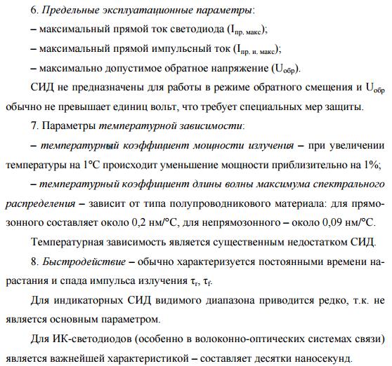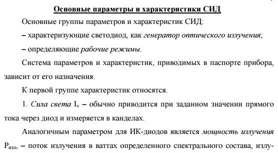 Излучаемый светодиодом свет лежит в узком диапазоне спектра. Иными словами, его кристалл изначально излучает конкретный цвет (если речь идёт об СД видимого диапазона) — в отличие от лампы, излучающей более широкий спектр, где нужный цвет можно получить лишь применением внешнего светофильтра. Диапазон излучения светодиода во многом зависит от химического состава использованных полупроводников.